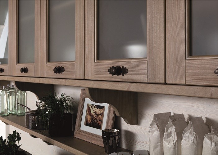 In einer edlen antiken dunkelgrauen Variante präsentiert sich diese gebürstete sowie „gekalkte“ Front mit ihrer Panelfüllung, die sehr stark an Großmutters Zeiten verweißt. Eine buffetartige Anordnung der Aufgabenareale Spülen, Kochen und Unterbringen sowie die offensichtliche griffbereite Unterbringung von Töpfen und Pfannen an der Wand erinnern daran